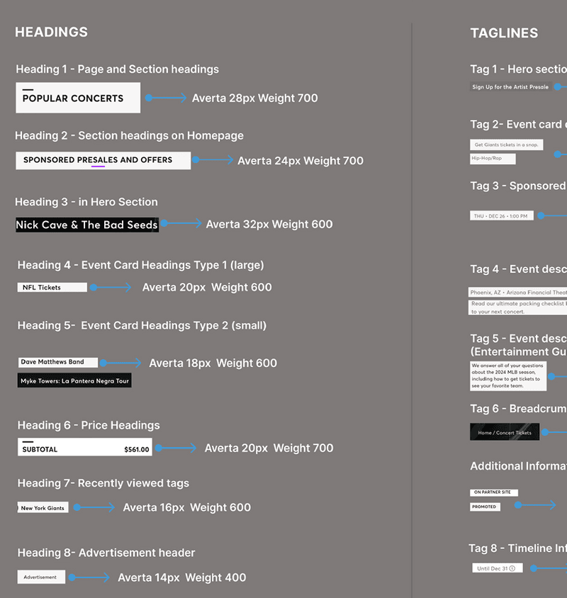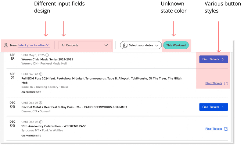 The UI inventory not only helped us understand the design patterns Ticketmaster used, but also revealed weaknesses such as inconsistent components, unorganized use of colors and typography, and accessibility issues that hinder the user experience.