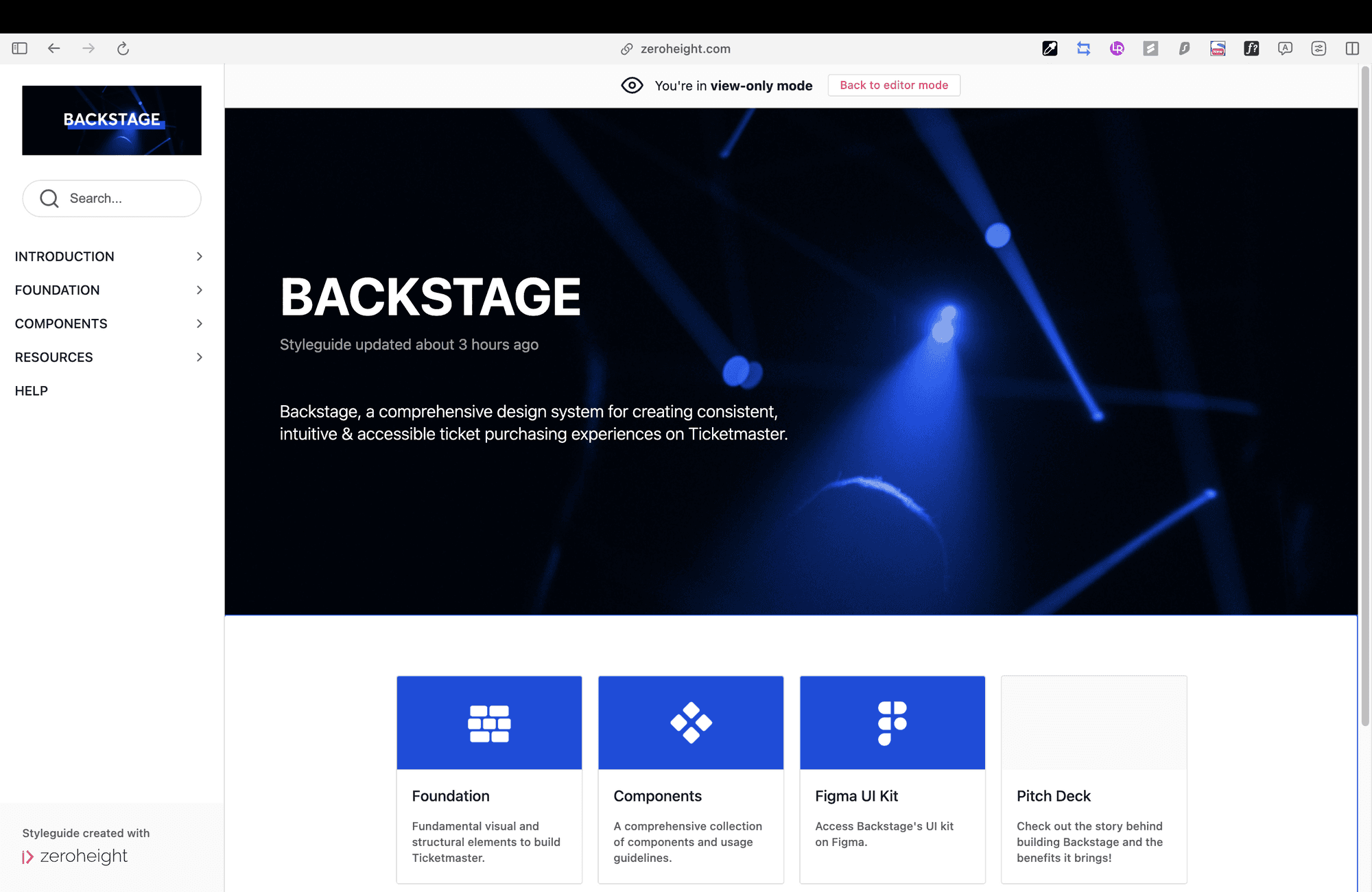 It introduces internal stakeholders to Backstage, offering access to foundational styles, components, downloadable design resources, and ways to contribute or reach out to us.