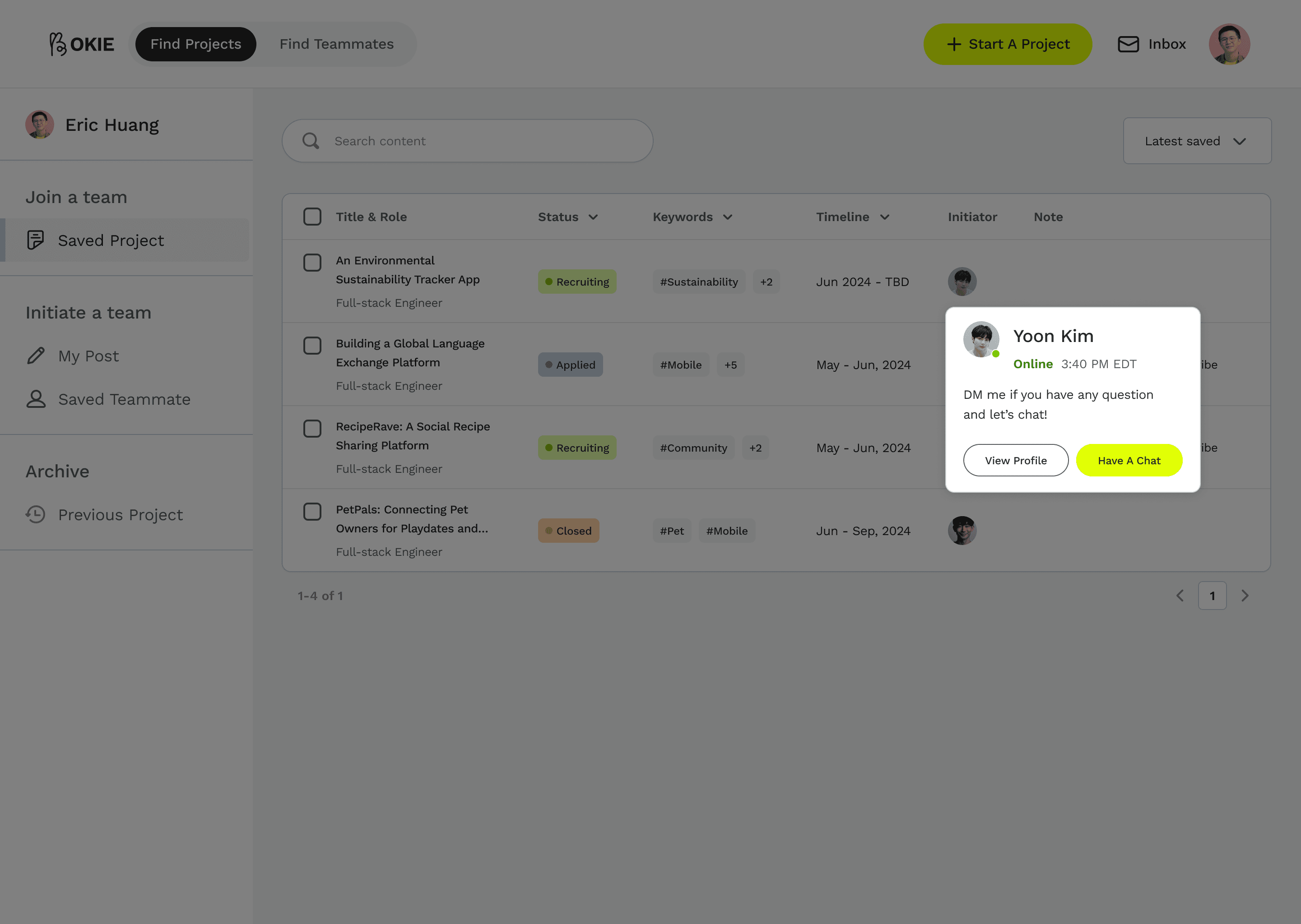 Project initiators can chat with ideal teammates anytime, anywhere.