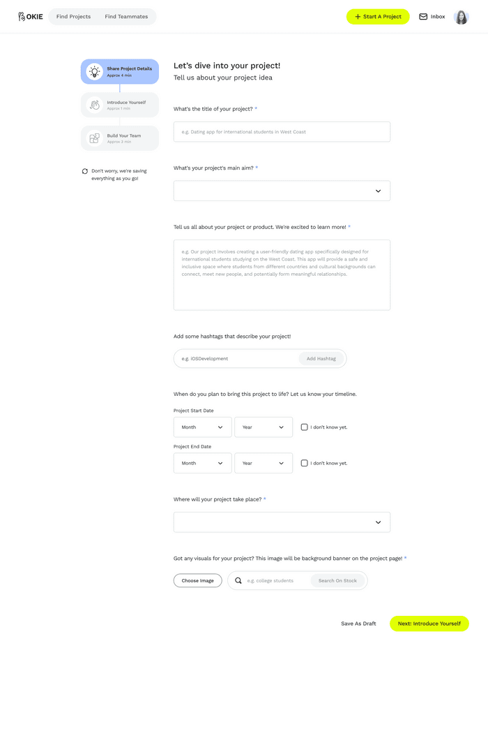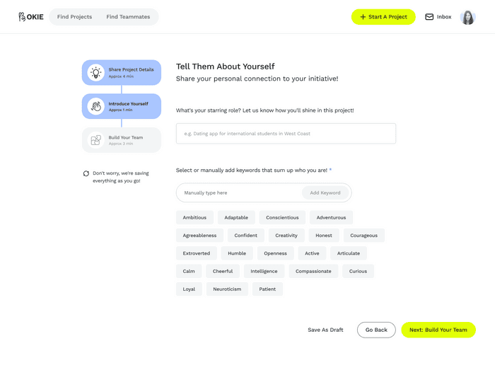 Okie is a professional networking platform designed to break down skill silos for side project participants. By designing structured project requirements and partner filtering mechanisms, I created a digital experience that enables developers, designers, and product managers to form teams and launch side projects based on shared passion and complementary expertise.