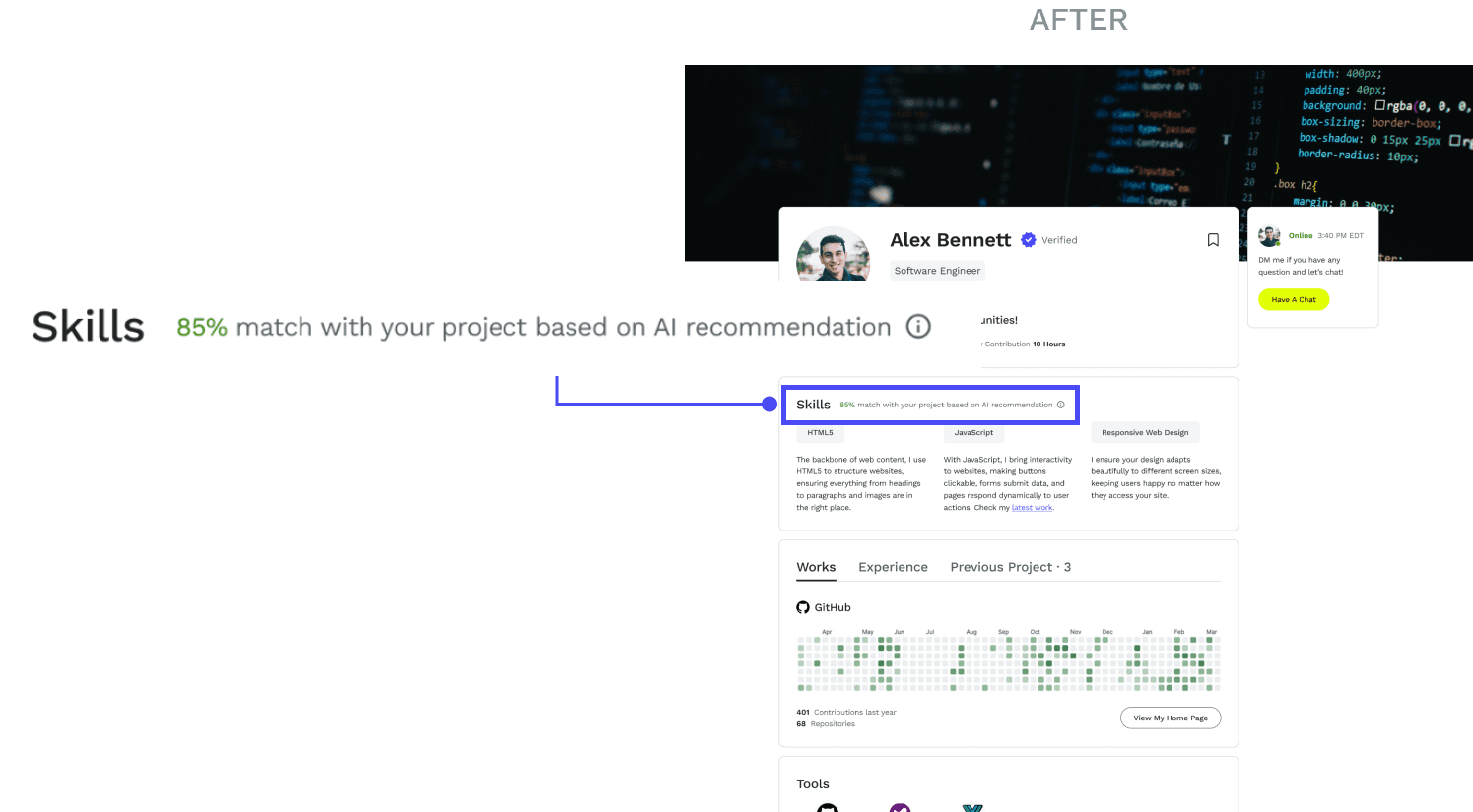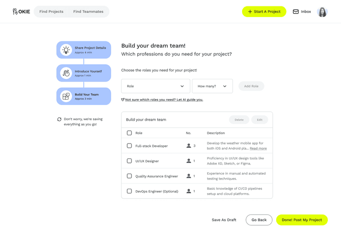 Considering the project initiator's perspective, we also added a small AI recommendation feature to show how well the other user matches the project needs you've specified.