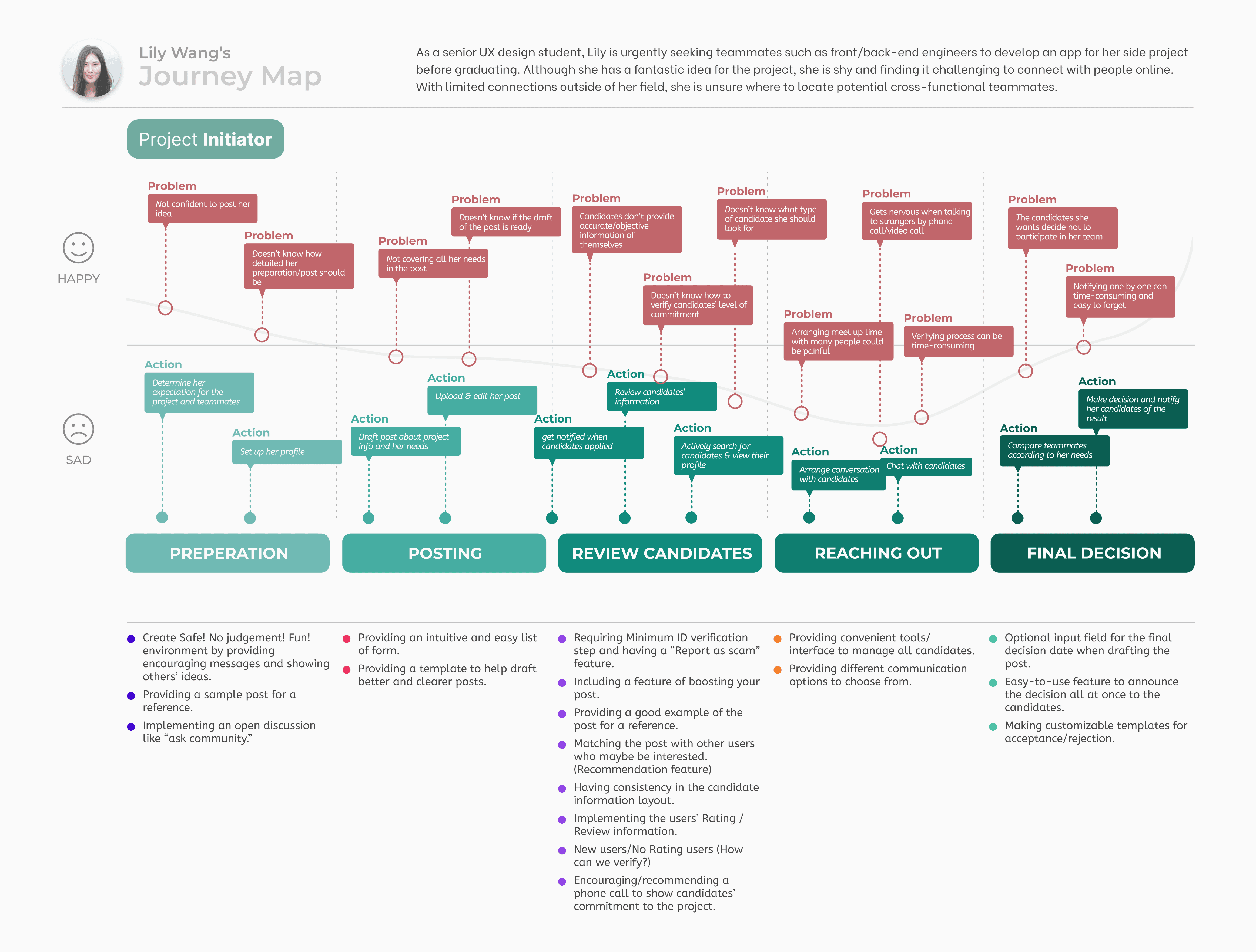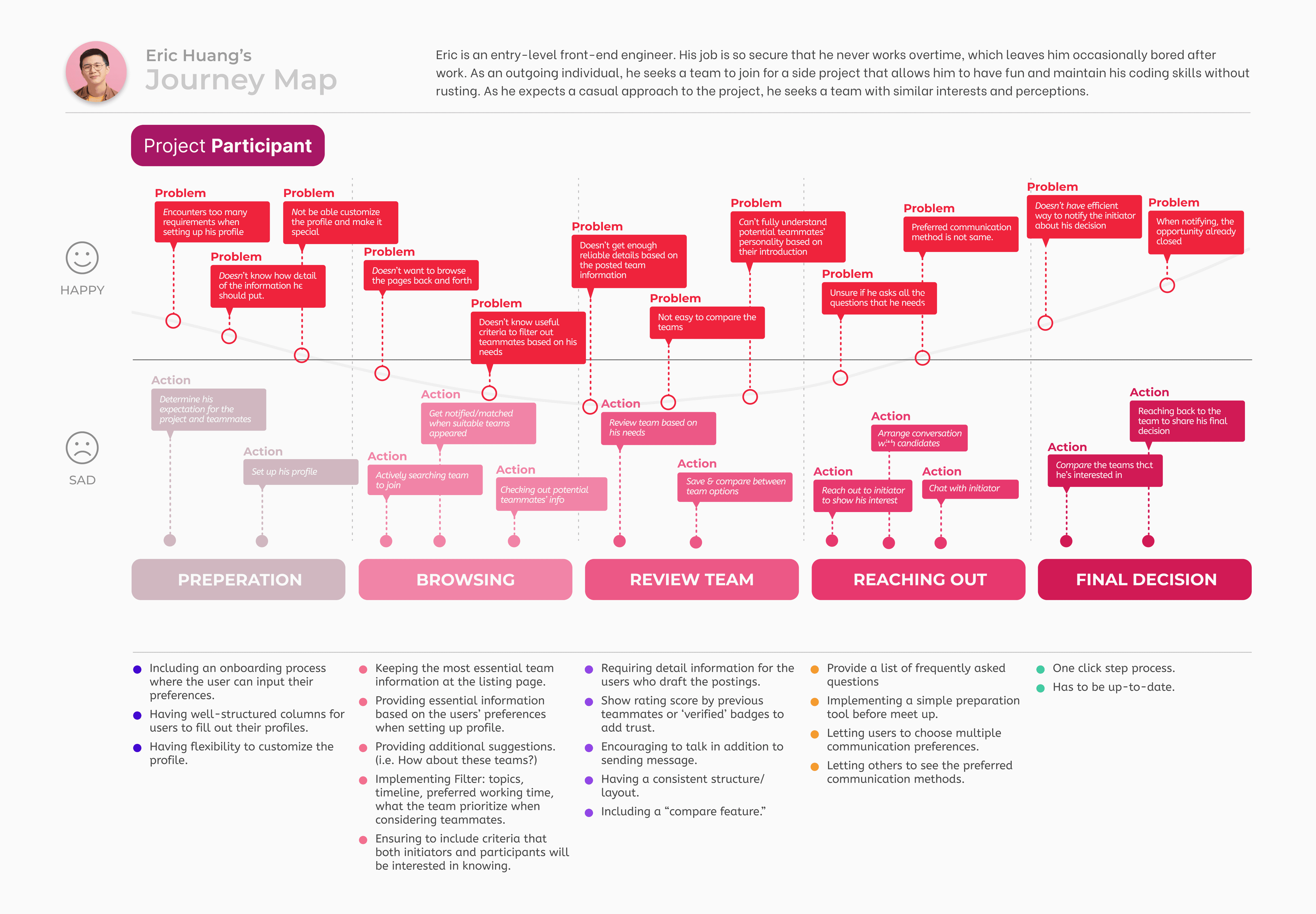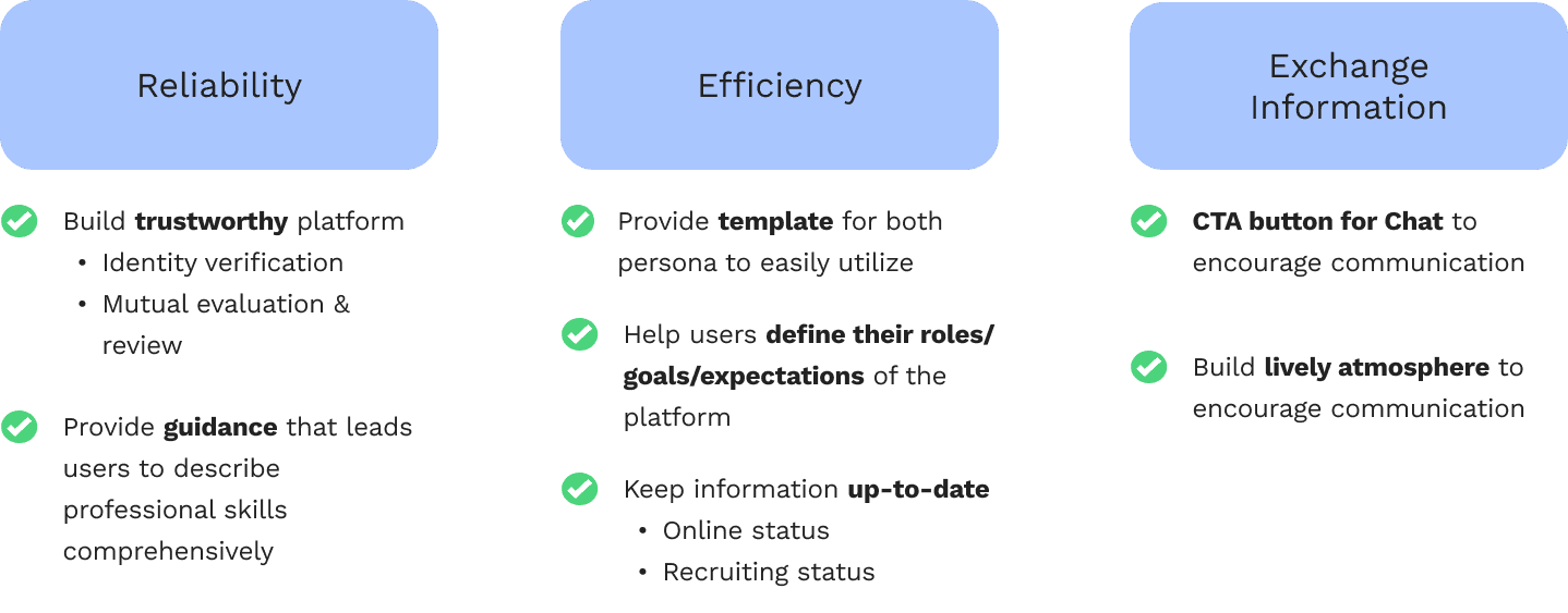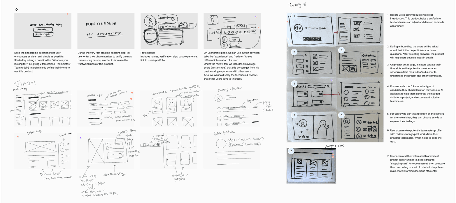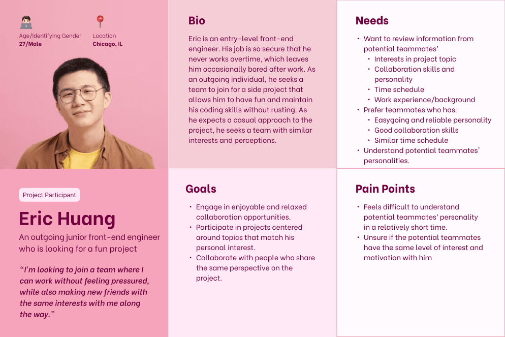 Through 10 in-depth interviews and affinity mapping, we concluded 3 top user painpoints in finding teammates and participating in side projects.