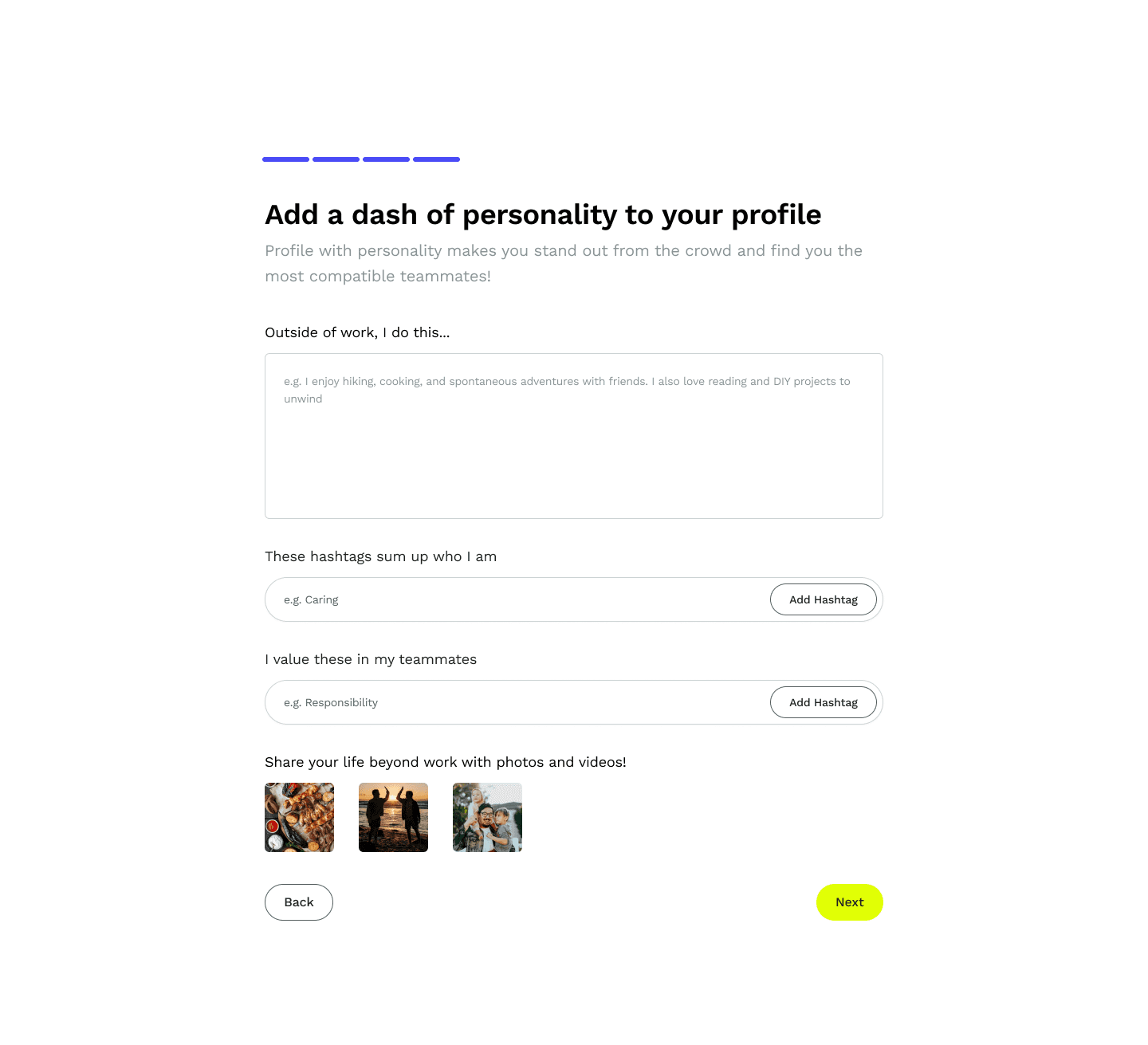 The onboarding design guides you to share not only typical professional info but the personal side of you. Find not just 'co-workers,' but compatible friends you'll enjoy working with all the time :)