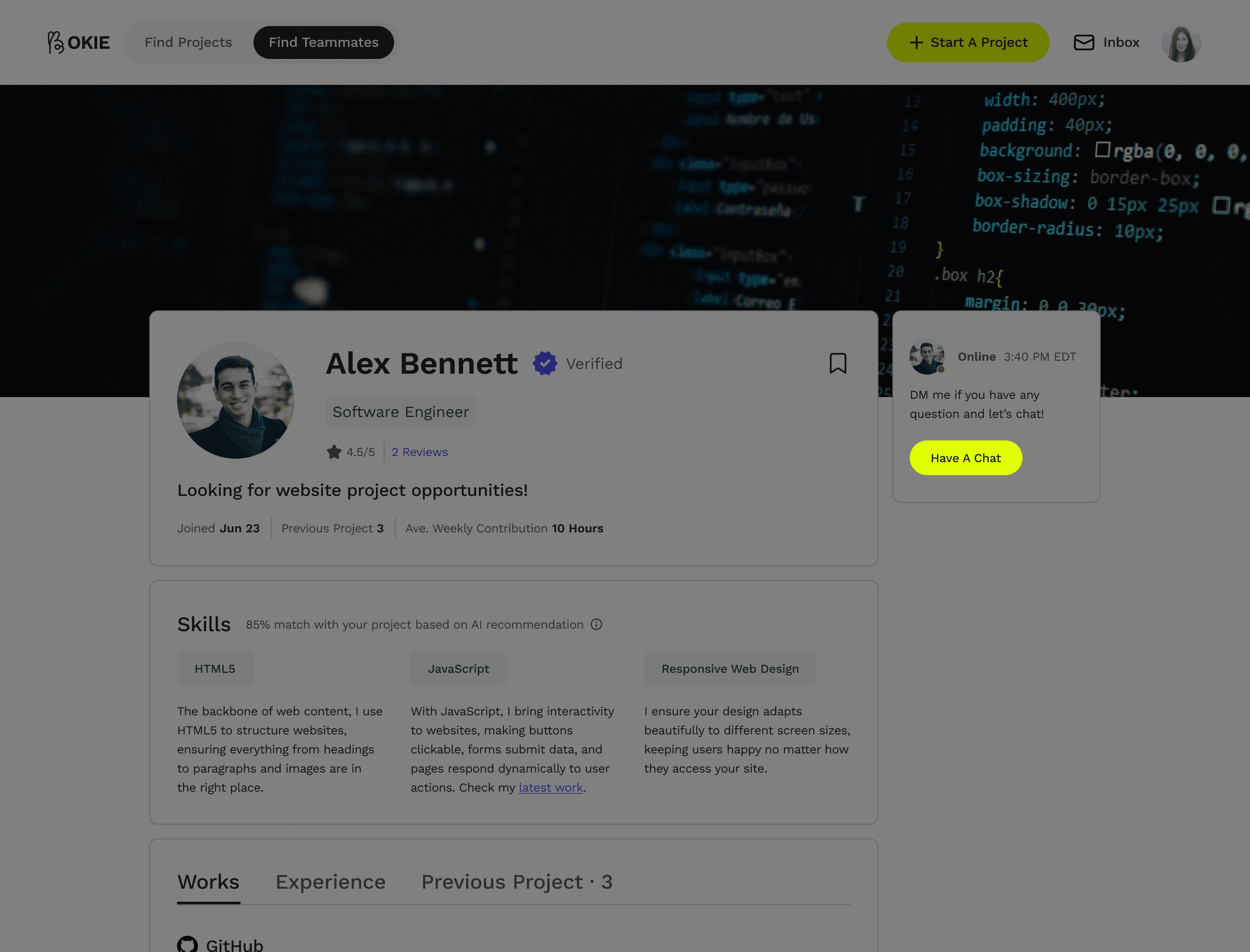 On profile pages, we prioritized users’ skills and past work experience on the top because when reviewing teammates, most users value them more than personal introductions.