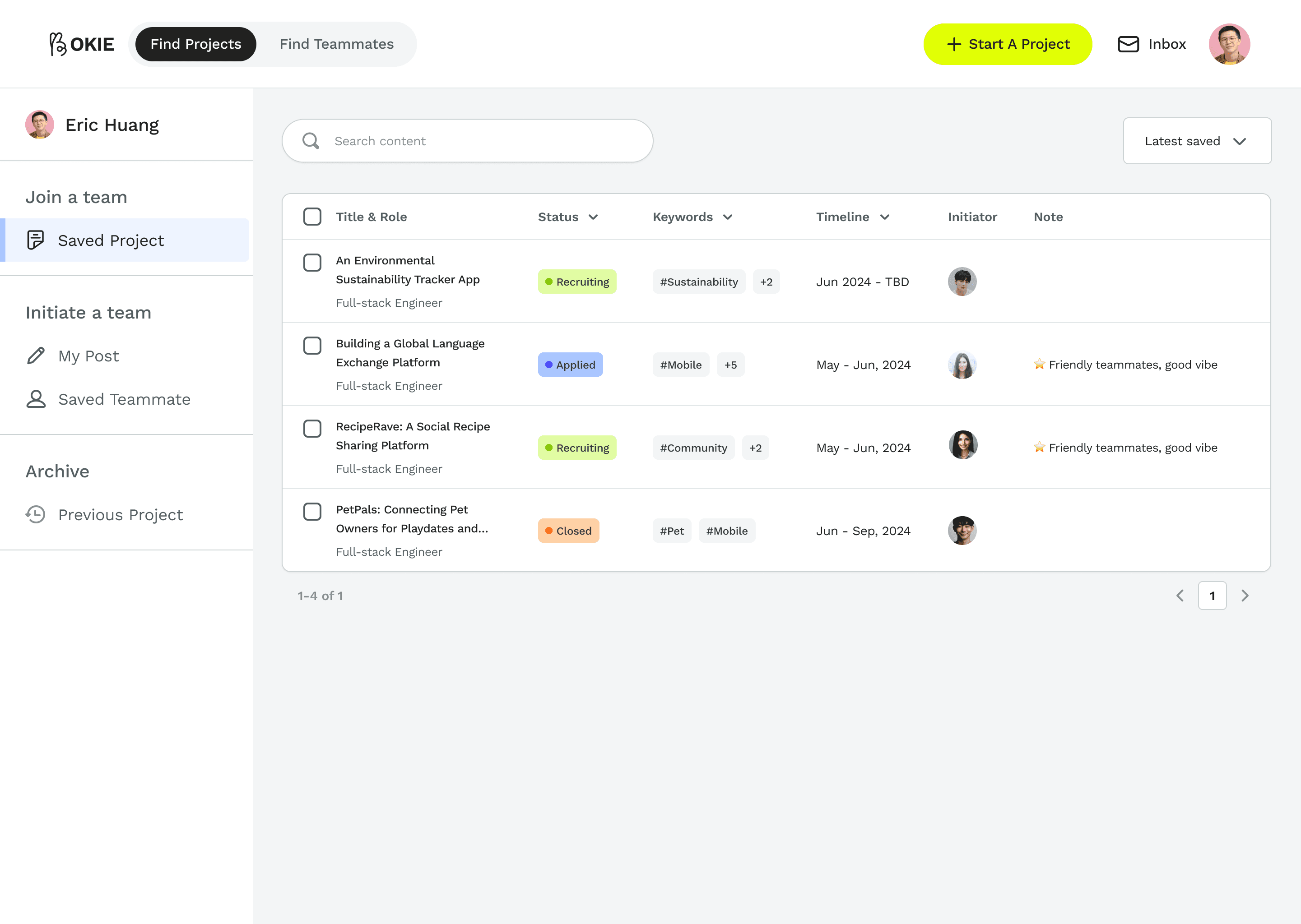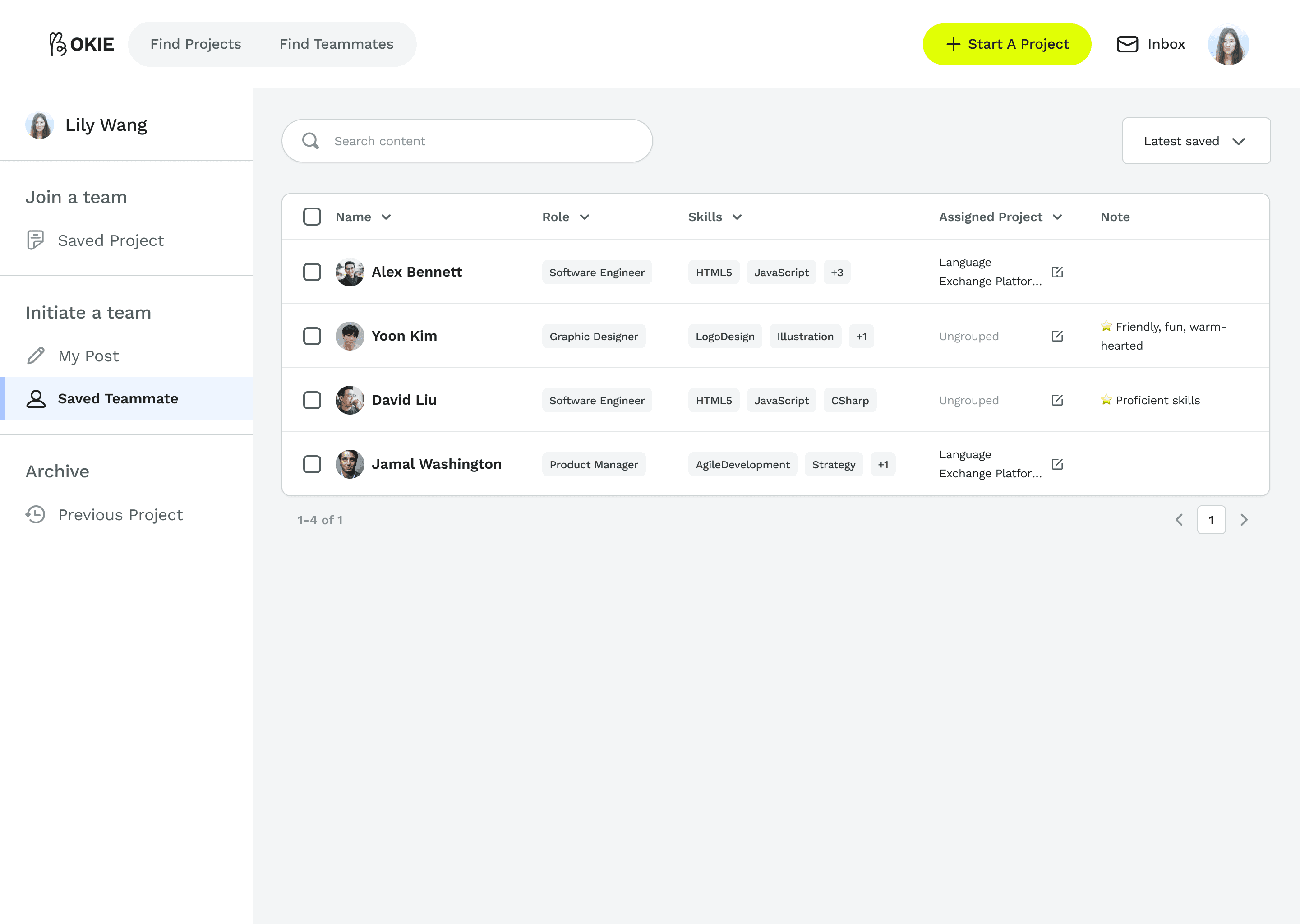 Users can save and categorize potential teammates or project teams that catch their attention. The management tool allows for easy comparison, helping them identify and connect with the best people efficiently.