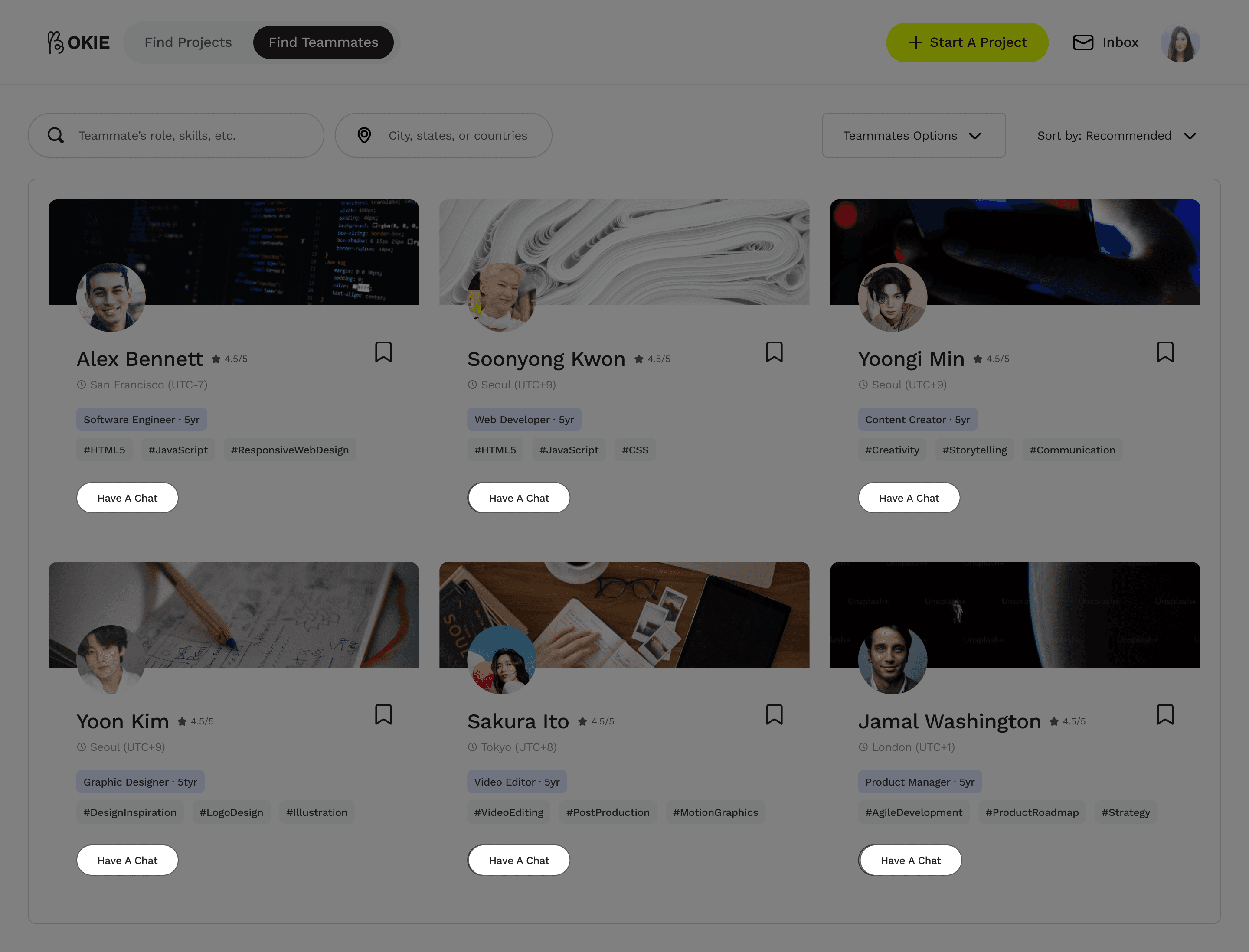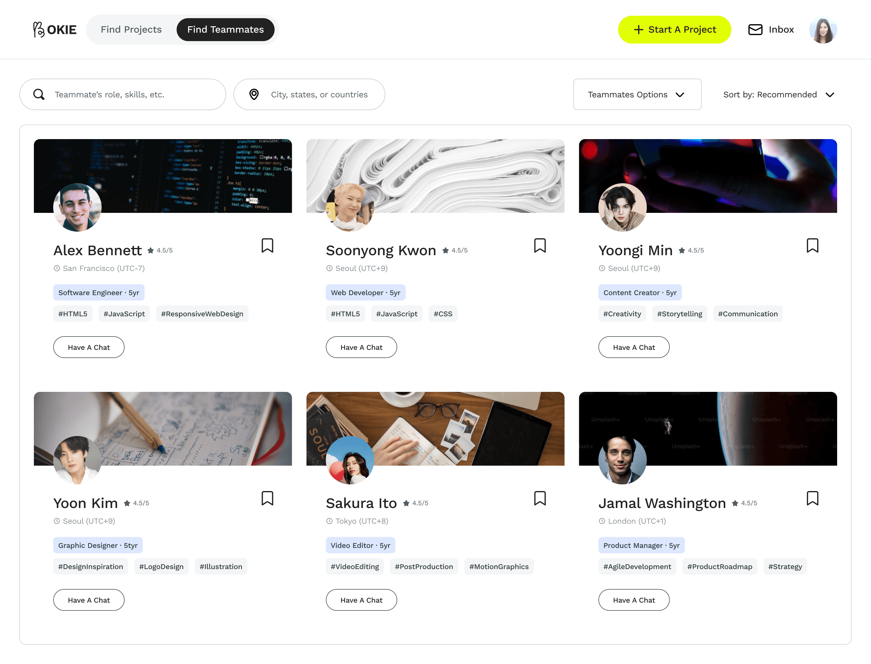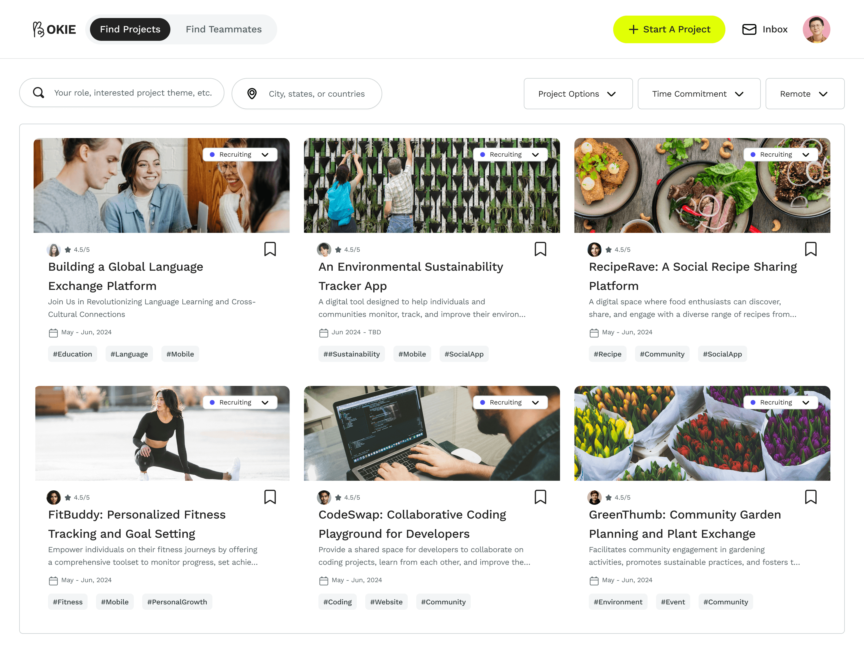 Users can seamlessly switch between two modes—browsing other user profiles, skills, and past projects to find teammates or filtering project opportunities to discover teams that align with their interests. The card design on Home prioritizes key information for quick browsing.