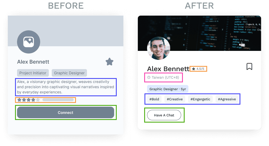 Based on user test feedback, we replaced long text with personality tags, renaming 'Connect' button to 'Have a Chat', adding time zone of the user to indicate working hours compatibility, and compacting star ratings for a concise layout.